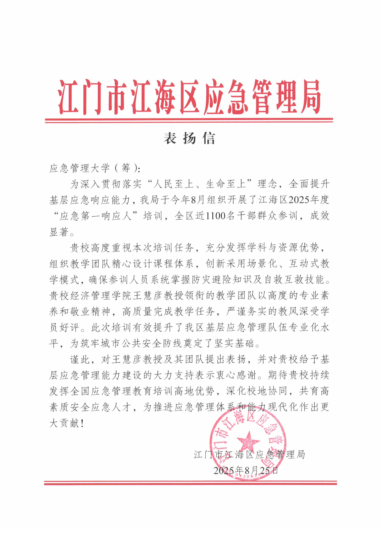 近日,学校与江门市江海区人民政府战略合作共建的“国际社区防灾减灾研究中心”充分发挥学校应急管理专业学科优势,高质量完成江门市江海区2025年度“应急第一响应人”培训任务。全区近1100名基层干部、社区工作者、群众代表(包含4名港澳同胞)通过接受系统化培训,显著提升了防灾避险与应急处置实战能力,为筑牢大湾区城市安全防线提供了有力支撑。