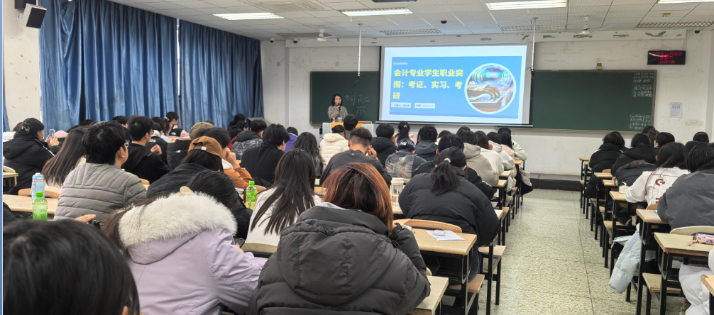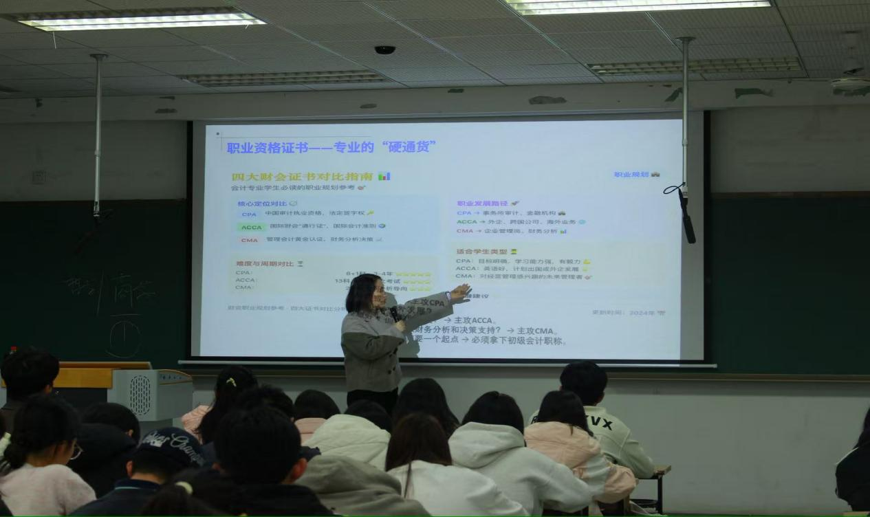互动问答环节,同学们热情高涨,“零基础怎么快速入门会计实操?”“跨境贸易财务岗位的招聘要求是什么?”莫老师耐心解答,还分享了会计学习的实用资源、考证时间线和职业发展路径,鼓励大家从大一开始搭建跨专业知识体系,通过参加技能竞赛、实习实践、证书准备等方式积累经验,提前为职业突围铺路。不少人表示,这场讲座让自己对未来的职业规划有了清晰认知。